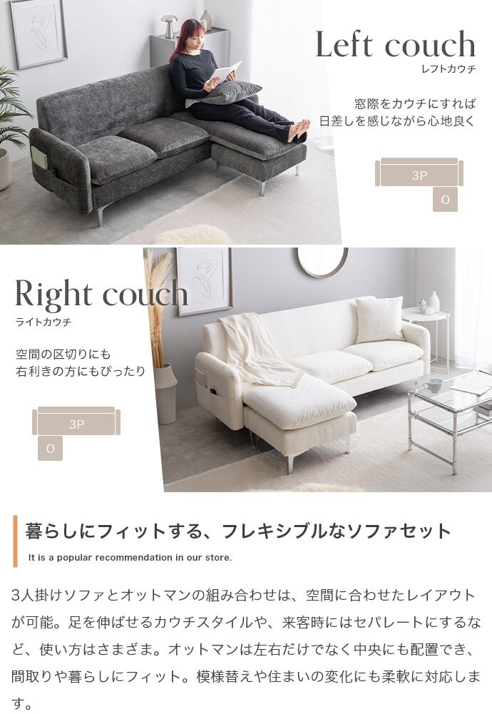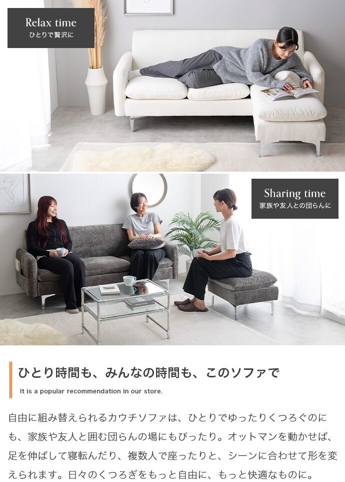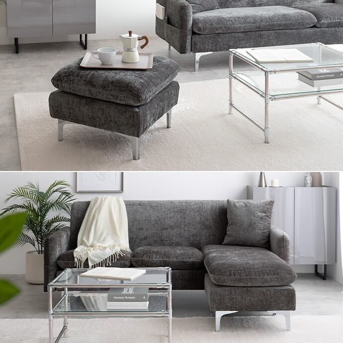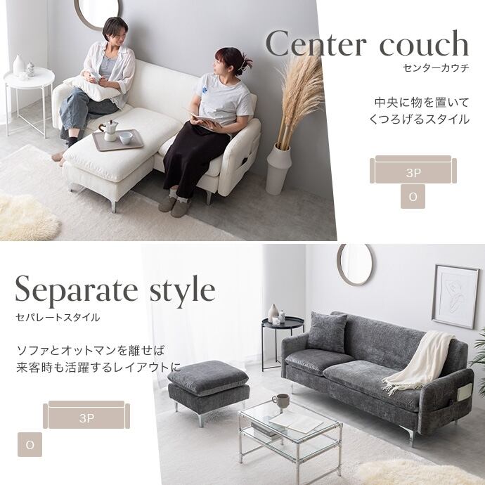 ソファ本体とオットマンの組み合わせにより、左右のカウチスタイルはもちろん、センターカウチやセパレート使いなどシーンや気分に合わせた多彩なレイアウトが楽しめます。