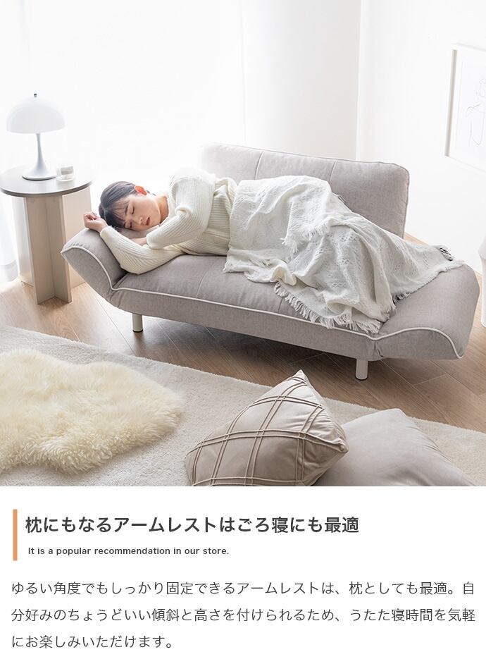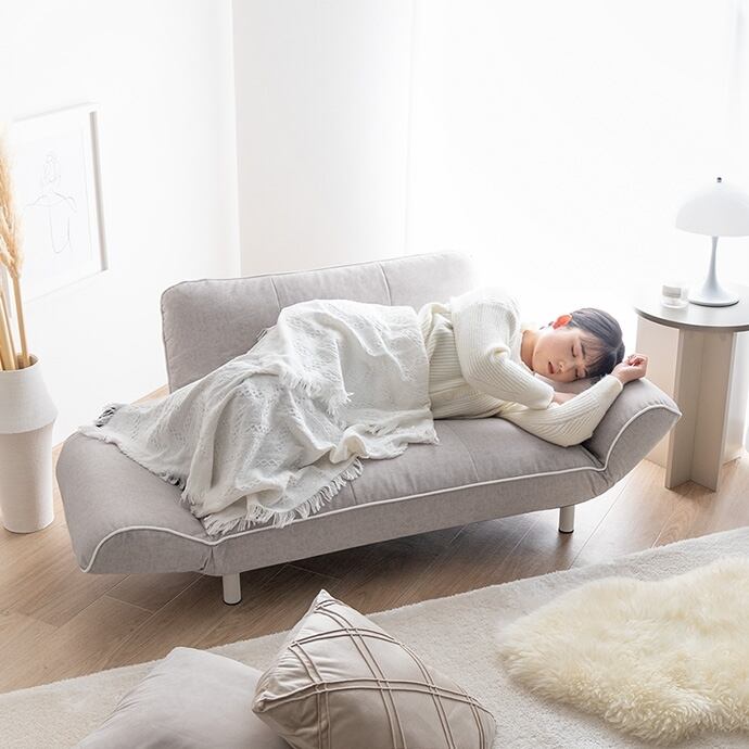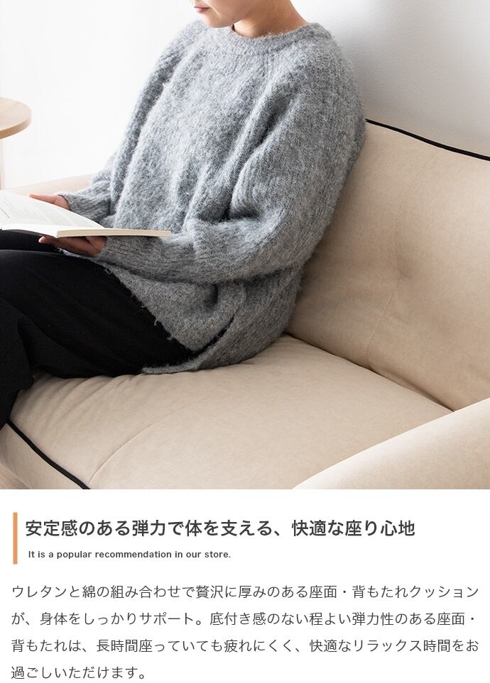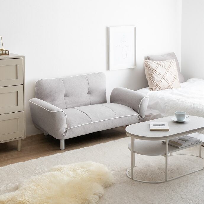 バイカラーのパイピングはソファの柔らかな可愛さを引き出し、置くだけでお部屋のアクセントに。