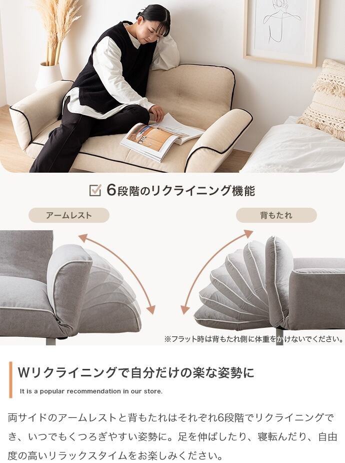 6段階でリクライニングする背もたれとアームレストはお好みの角度で調節ができ、自分だけのくつろぎ空間が作り出せます。