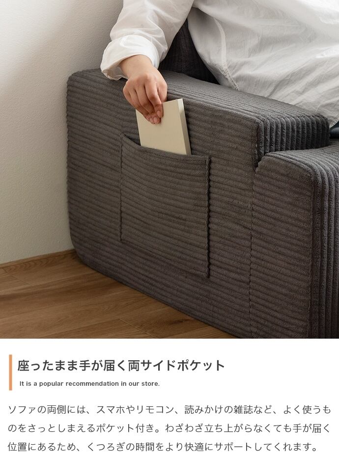 両側には小物の収納に便利なポケット付きで、リモコンや雑誌などをさっと片付けできます。