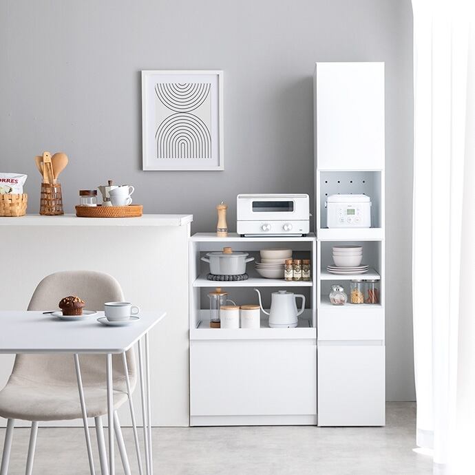 コンパクトでシンプルなデザインながらもたっぷり収納できるため、キッチン周りの様々なものをこの1台にまとめて収納可能。
