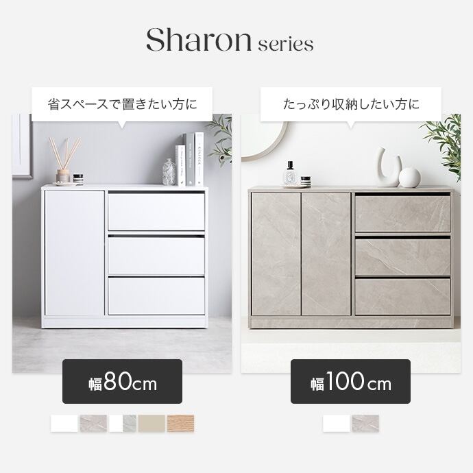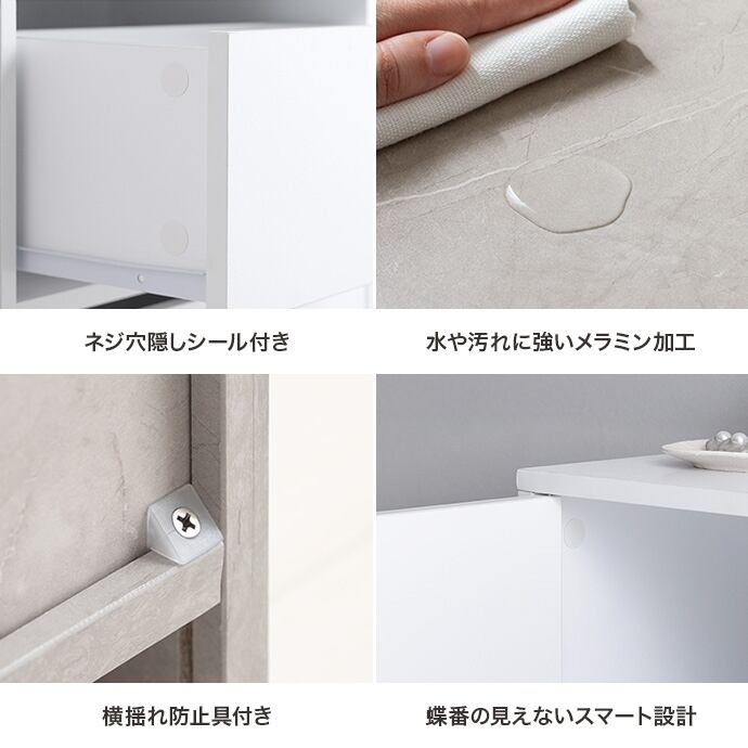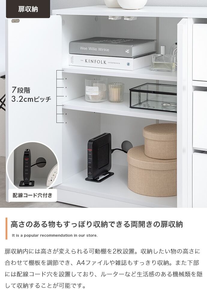 2枚の可動棚付きの扉収納とたっぷり入る3杯の引き出しは、雑多な生活感を隠し、お部屋をすっきりと演出。