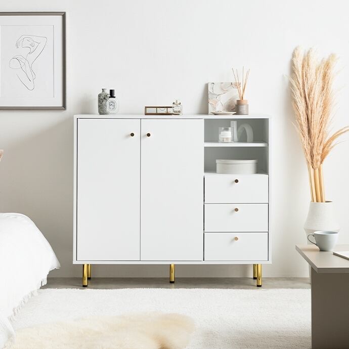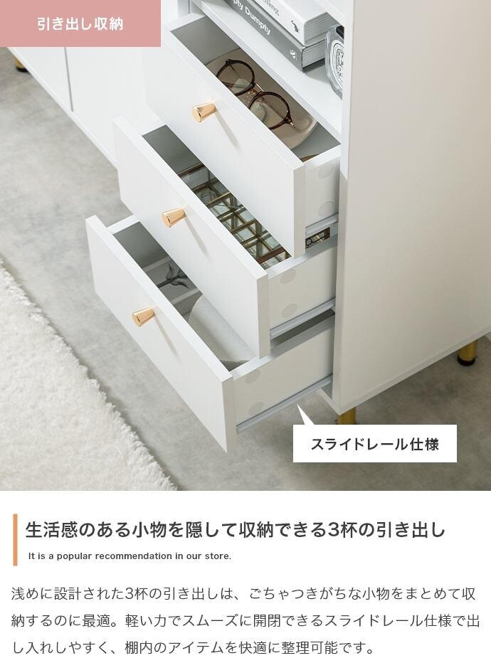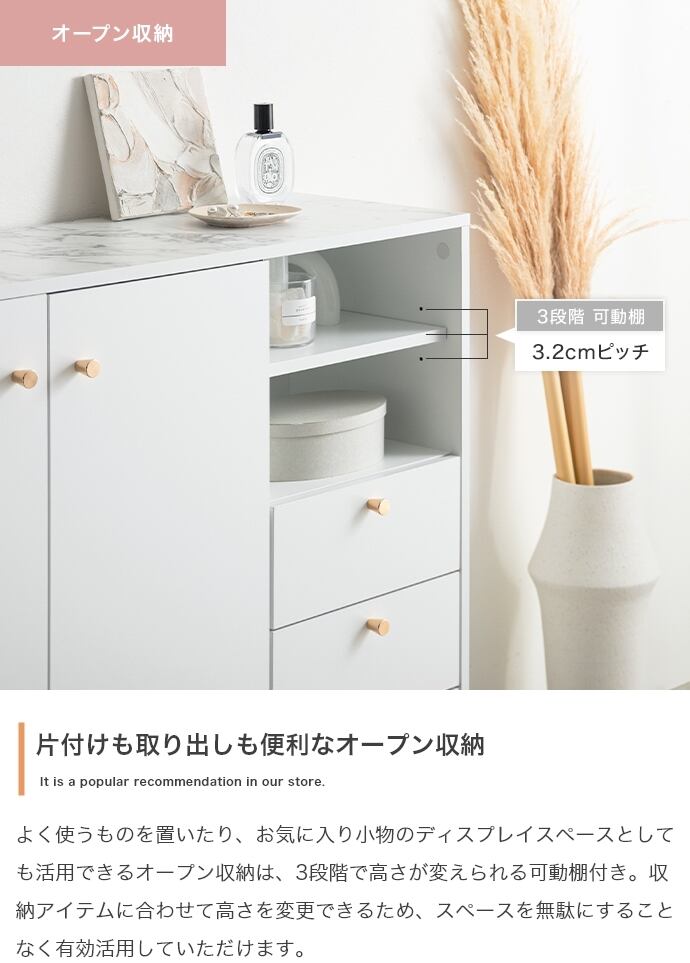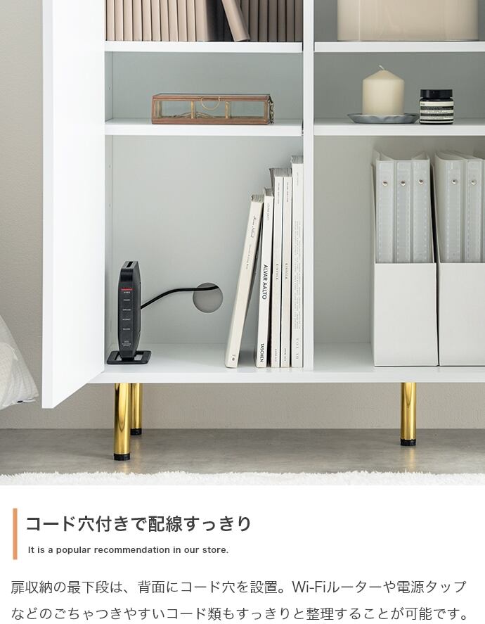 3つの収納スペースと背面のケーブル穴で、ごちゃつきがちな雑貨や雑誌、LANケーブル類などもスマートに整理でき、生活感がなく美しい空間を実現可能です。