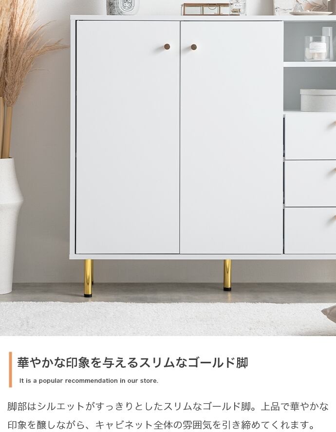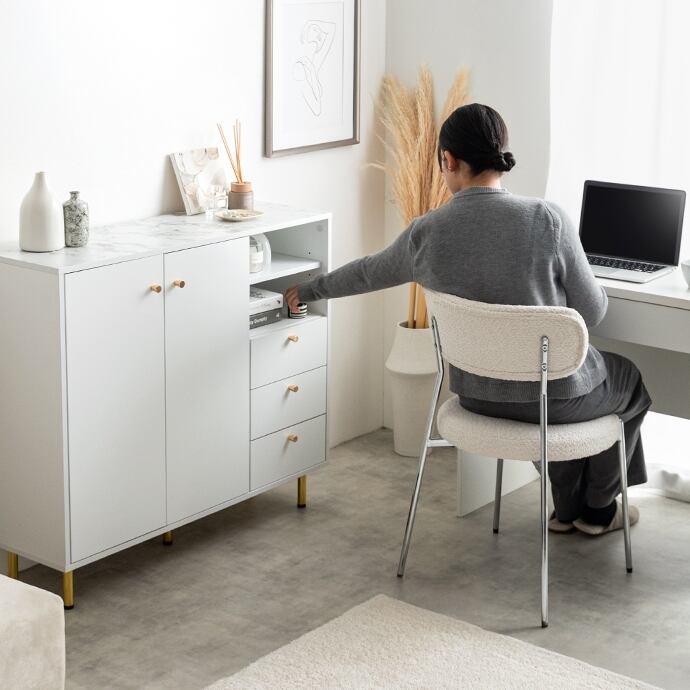 天板の大理石柄とゴールドのあしらいが特徴のキャビネット。