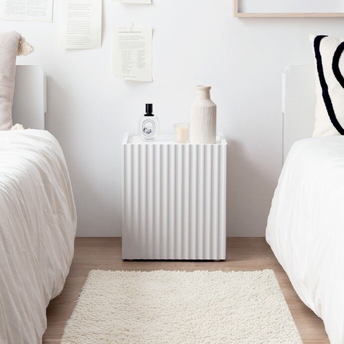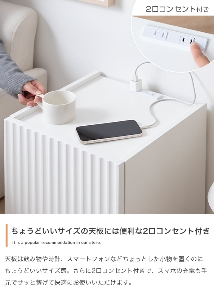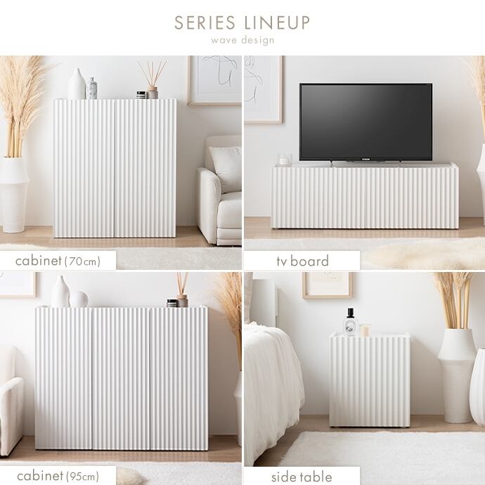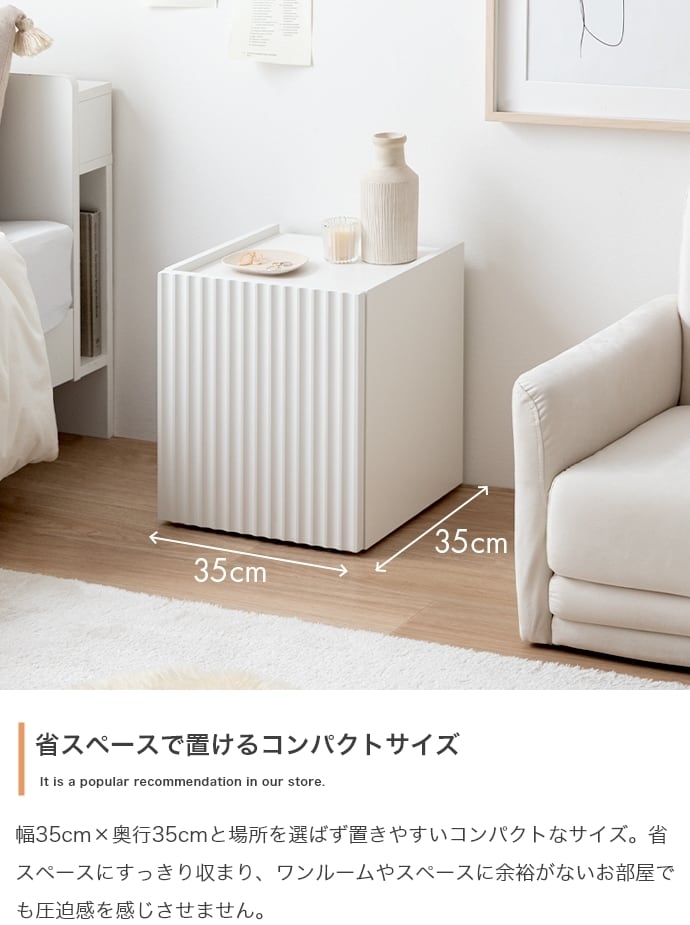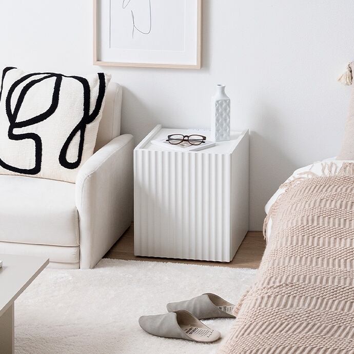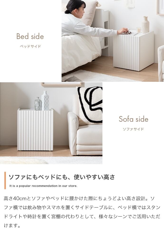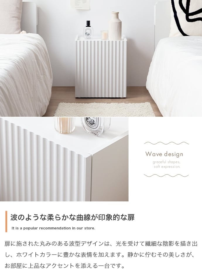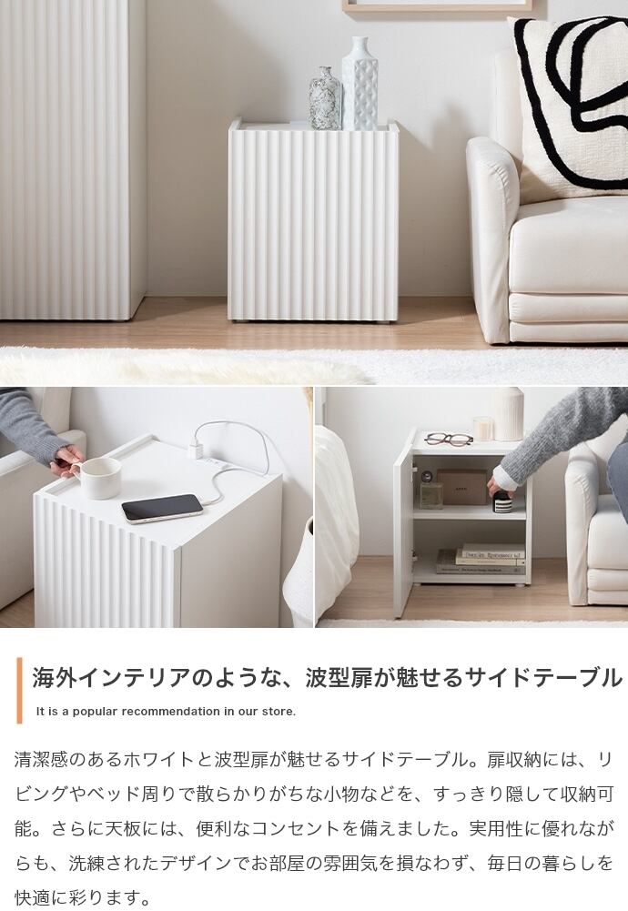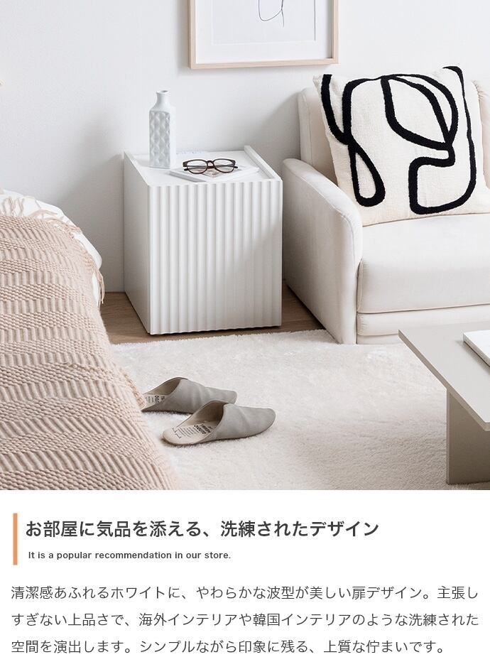 清潔感のあるホワイトと波型扉が魅せるサイドテーブル。