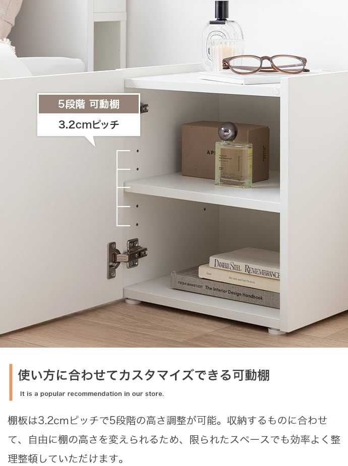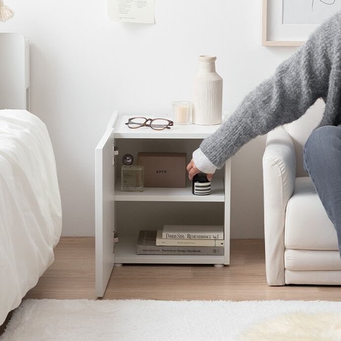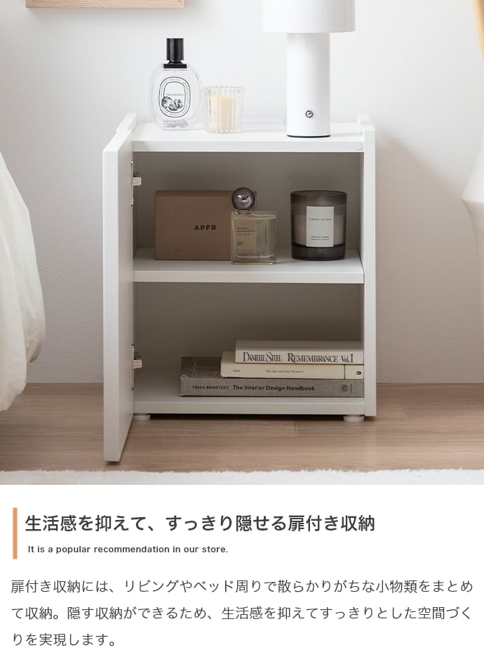 扉収納には、リビングやベッド周りで散らかりがちな小物などを、すっきり隠して収納可能。