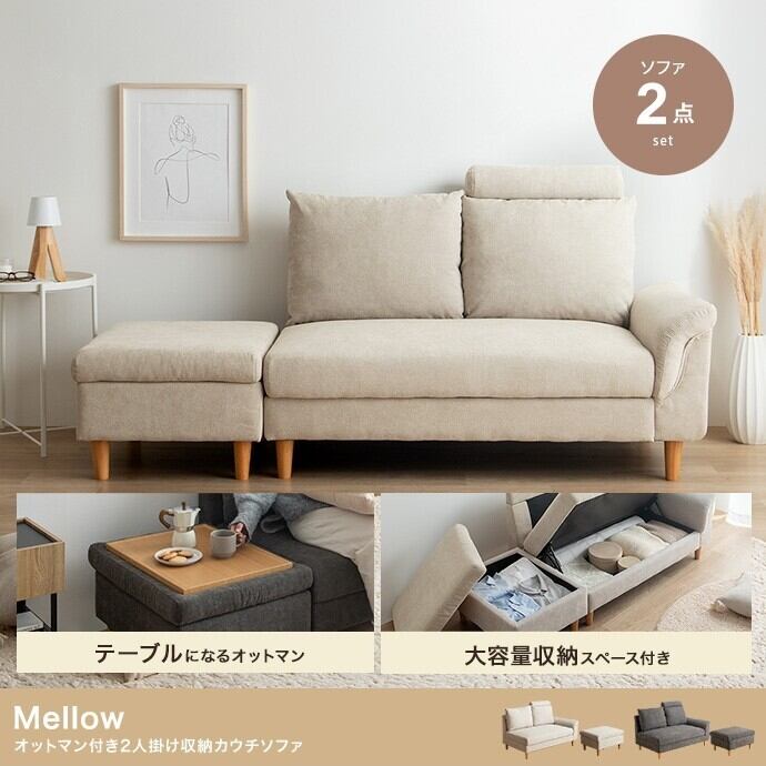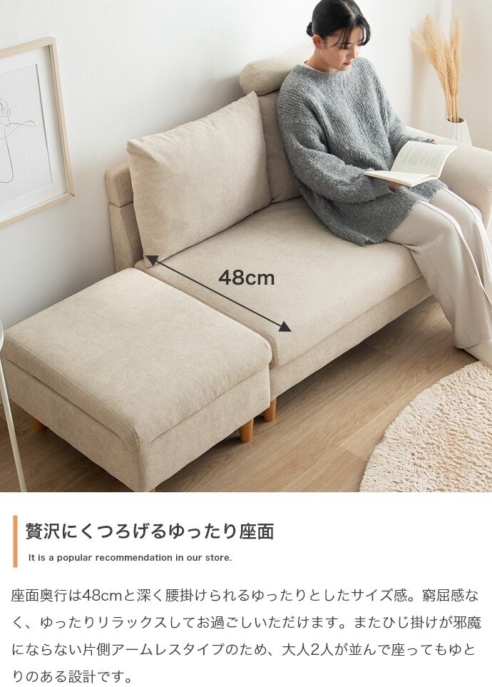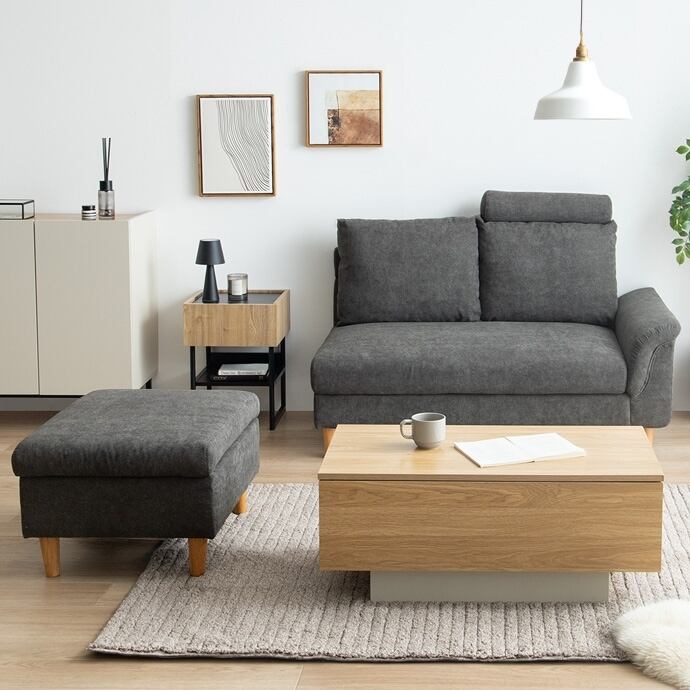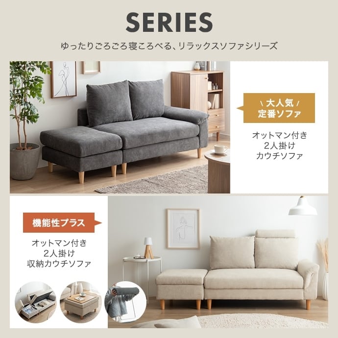 2人掛け 収納カウチソファ オットマン付き 2点セット