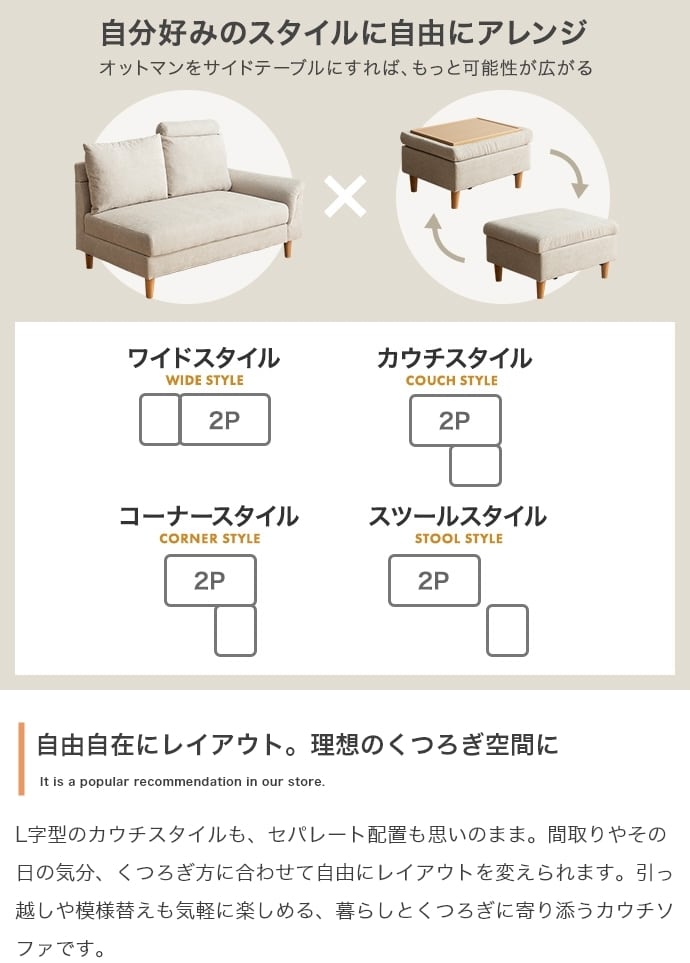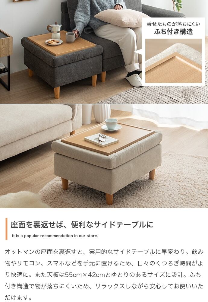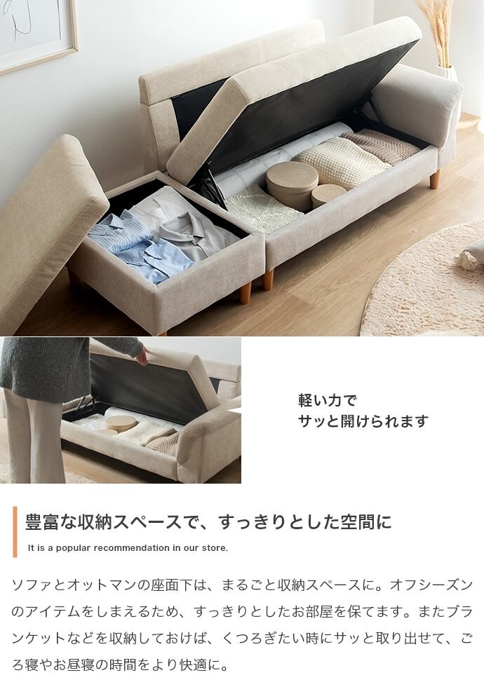 またソファとオットマンはどちらも座面下に収納スペースを備え付け。