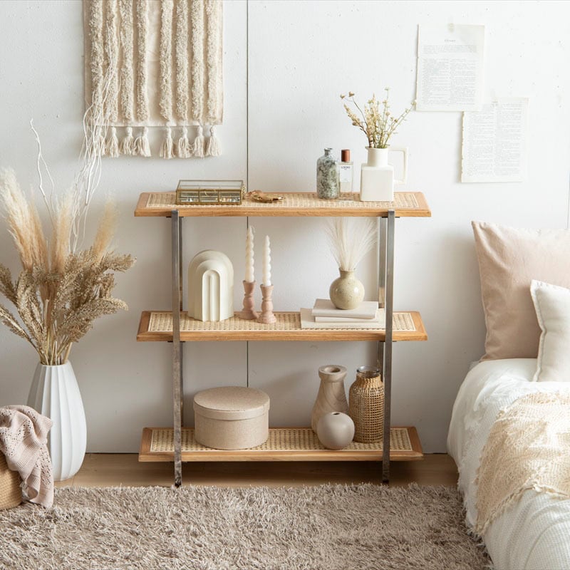 ナチュラルさの中に一味違う大人な印象を持つ、天然素材のラタンを用いた3段シェルフ。