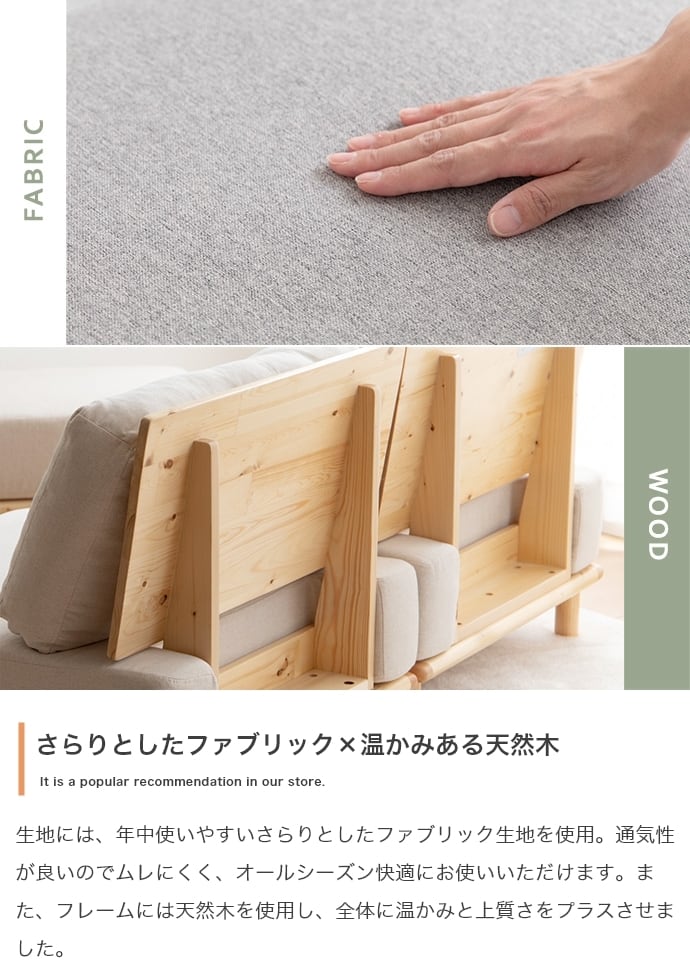 天然木、ファブリック、ウレタン、ポケットコイル(座部)、ポリプロピレン綿、天然木