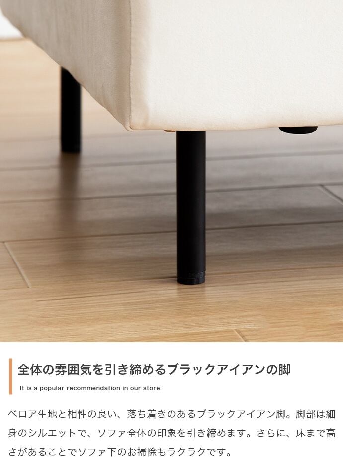 ベロア×ブラックアイアン脚の組み合わせが、空間に上質な印象を与えます。